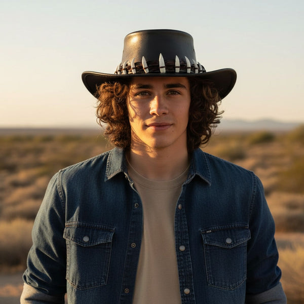 The Jacaru 112SE Lightning Jack Special Edition hat is unapologetic and bold! This unique hat is made from quality waxed cow leather and crowned with a massive amount of 15 (!) genuine crocodile teeth on a strip of crocodile backstrap. This is Crocodile Dundee in overdrive!